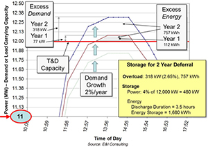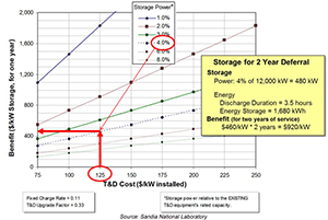 Consider the T&D upgrade deferral example shown graphically in Figure 1. Storage whose rated power output is 4% of the T&D equipment’s power rating will defer an upgrade of T&D equipment for two years.