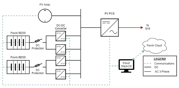 The primary challenge in deploying DC Coupled systems is the management of the common DC Bus voltage between the BESS, PV Array, and PV PCS. This is accomplished through the addition of DC-DC Converters on either the PV Array or, more commonly, the BESS. Synchronizing control of those DC-DC Converters with the PV PCS is accomplished through a single point of control. Some of the PCS and DC-DC Converter vendors have their own control schemes which centralize that control, but they will also then require that their DC-DC Converters are only used with their PV PCS. To allow maximum flexibility in hardware selection, Powin has developed a Power Plant Controler (PPC) for DC Coupled systems which is vendor agnostic. By centralizing this control within the Powin StackOS platform, we can closely couple full system control with battery health and performance. This allows for a finer level of visibility and optimization when compared to competitor solutions. Powin has partnered with Amp Energy on a portfolio of DC-Coupled projects in Massachusetts which leverage Powin’s PPC to integrate Dynapower DC-DC Converters with a Power Electronics PV PCS.